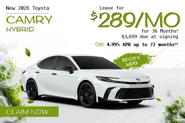 *$289 per month lease for 36 months available on select new 2026 Toyota Camry Hybrid models to qualified customers who lease through Toyota Financial Services (TFS). Advertised lease payment based on approved credit. No security deposit required. $3,699 due at signing includes first month’s payment and may include additional amounts depending on credit approval. Lessee responsible for official fees, taxes, excess wear and use, and $0.25 per mile over 10,000 miles per year. Stock Model #2559. Amount financed, down payment amount, and creditworthiness may impact availability of offer. Must take delivery from dealer stock. All offers plus tax, tag, title, and $858 dealer fee. See dealer for complete details. Offer ends 05/04/2026. ** Or 4.99% APR for 72 monthly payments of $16.10 per month per $1,000 financed. Must take delivery from the dealer's stock. All offers plus tax, tag, title and $858 dealer fees. With approved credit through TFS. Offer ends 05/04/2026.